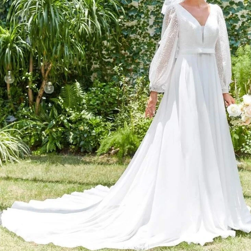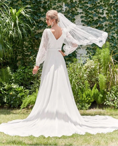 Contrast Mesh V-Neck Lantern Sleeve Chiffon Wedding Dress Without Veil
